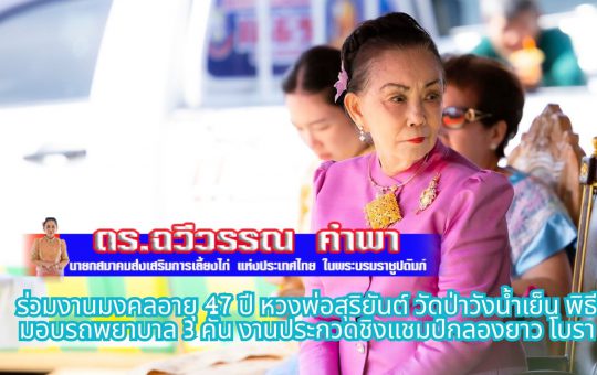 ดร.ฉวีวรรณ คำพา ร่วมงานมงคลอายุ 47 ปี หลวงพ่อสุริยันต์ วัดป่าวังน้ำเย็น พิธีมอบรถพยาบาล 3 คัน งานประกวดชิงแชมป์กลองยาว โบราณ